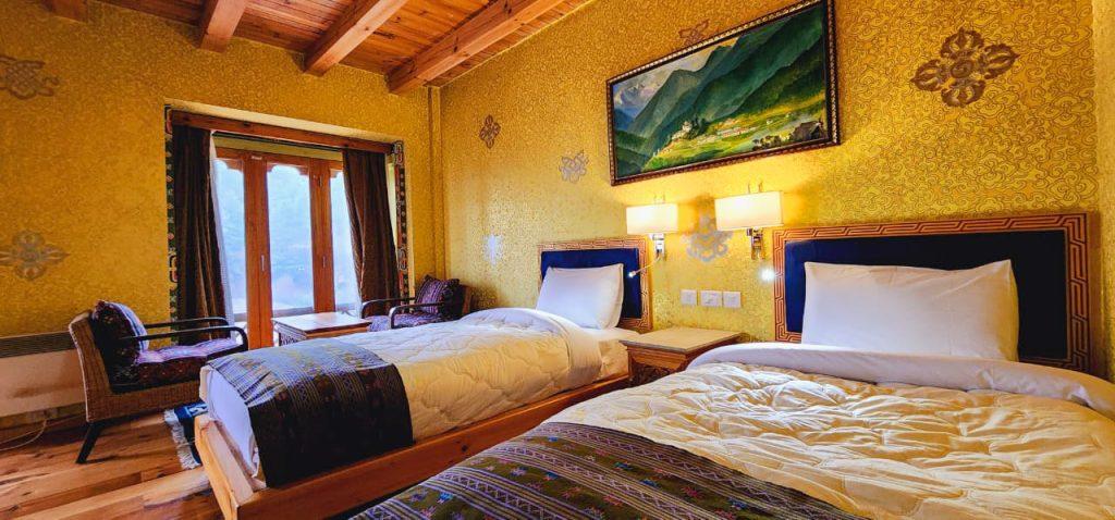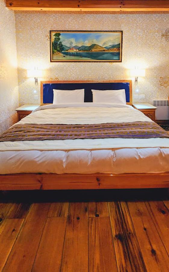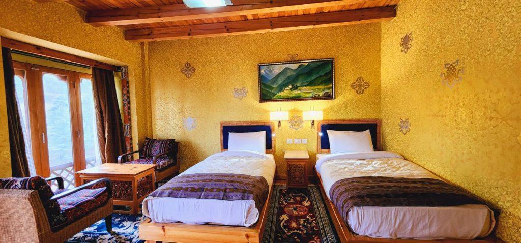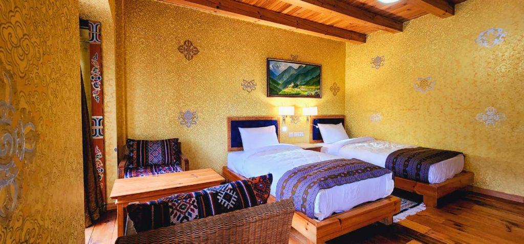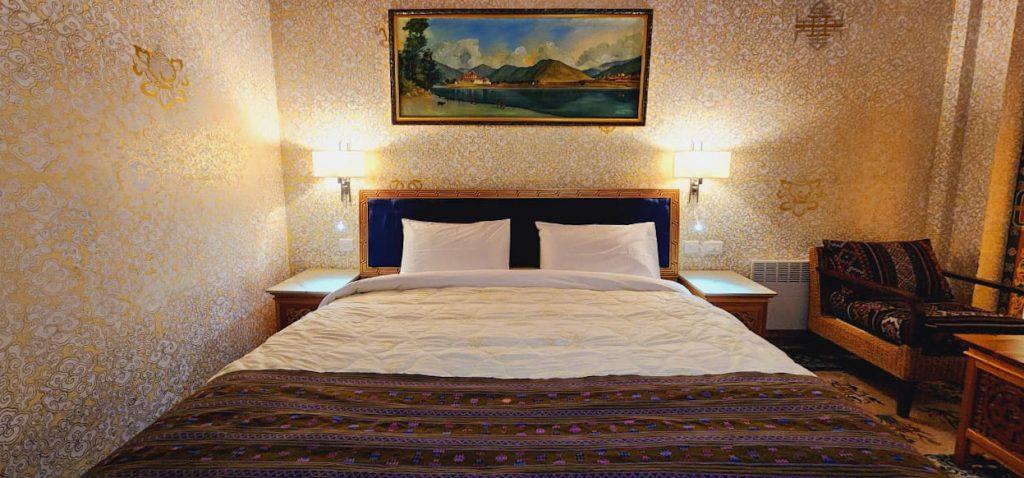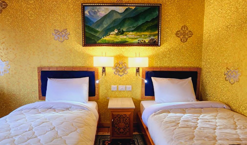 Our deluxe rooms are beautifully painted in traditional Bhutanese style with well furnished and modern fittings which includes high quality insulation system. Each toilet has separate shower and lavatory. Our Deluxe King Room is perfect for couples or solo travelers looking for a cozy and comfortable homely stay. The room is spacious and features a king-sized bed or twin beds premium bedding, and plush pillows to ensure a good night’s sleep. The room also includes a work desk, a seating area, and a flat-screen on request for entertainment.